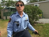 Lahey holds them all at bay with a loaded shotgun, and Randy tells Jim he's already called the real police. When Lahey fires a warning shot in the air, Randy tazes him and he is subdued. Jim starts crying and police sirens are heard in the distance. Randy begs Julian to cover this up so Lahey won't go to jail. Since the officer on scene is Erica Miller charming her out of an arrest is an easy task for him. However, as a part of his cover story, he cons Lahey out of $3000 saying they were simply discussing his offer to donate $3000 to the Sunnyvale Street Hockey Team. Miller takes Jim's badge and leaves the park.